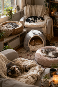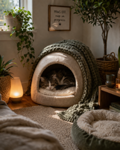 They love those little tucked-away spots that feel safe and quiet. A soft blanket in a basket, a cozy corner, a bed that feels like a cave… it doesn’t have to be anything fancy.
